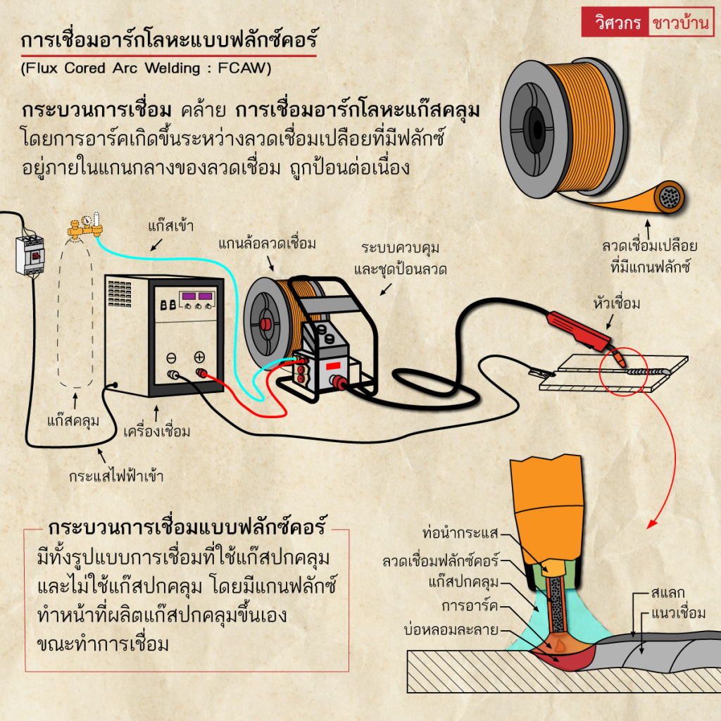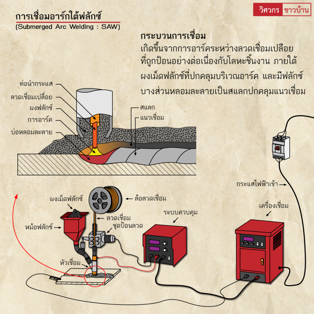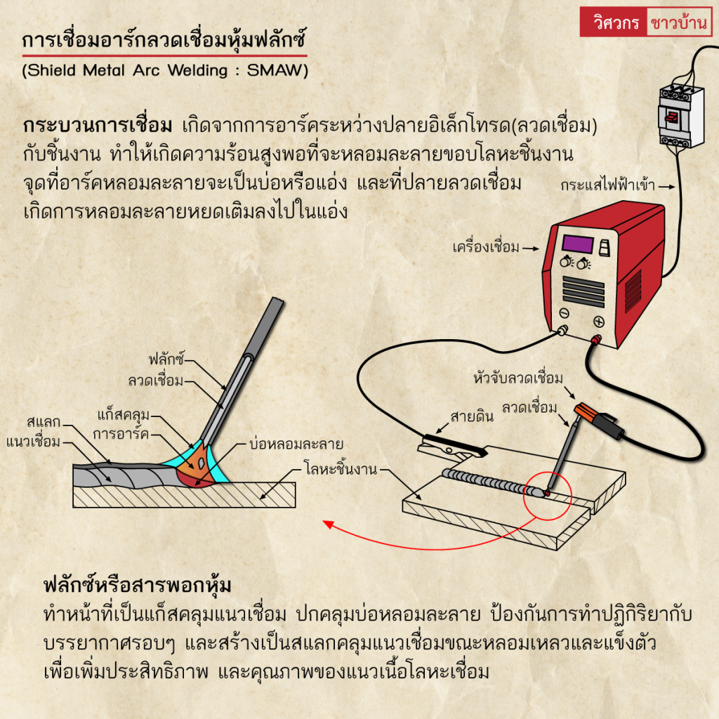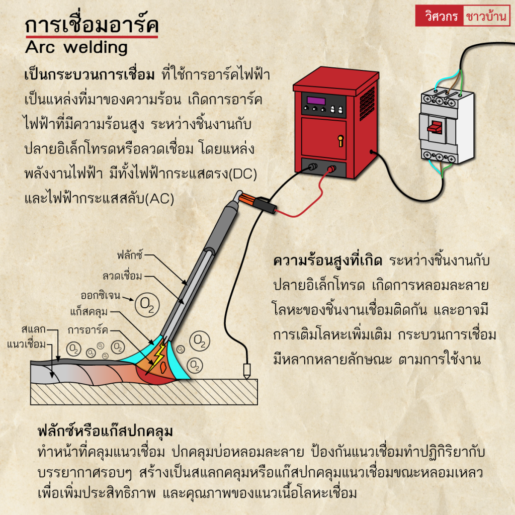 งานเชื่อมทั่วไปทำความรู้จักการเชื่อมอาร์ค(Arc welding) wisawakornchaobaan2 ปี ago2 ปี ago00 mins ทำความรู้จักการเชื่อมอาร์ค(Arc welding) เป็นกระบวนการเชื่อมที่ใช้การอาร์คไฟฟ้าเป็นแหล่งที่มาของความร้อน เกิดการอาร์คไฟฟ้าที่มีความร้อนสูง ระหว่างชิ้นงานกับปลายอิเล็กโทรดหรือลวดเชื่อม โดยแหล่งพลังงานไฟฟ้า มีทั้งไฟฟ้ากระแสตรง(DC) และไฟฟ้ากระแสสลับ(AC) โดยความร้อนสูงที่เกิดขึ้นระหว่างชิ้นงานกับปลายอิเล็กโทรด เกิดการหลอมละลายโลหะของชิ้นงานเชื่อมติดกัน และอาจมีการเติมโลหะเพิ่มเติม กระบวนการเชื่อมมีหลากหลายลักษณะ ตามการใช้งาน และมีฟลักซ์หรือแก๊สปกคลุมทำหน้าที่คลุมแนวเชื่อม ปกคลุมบ่อหลอมละลาย ป้องกันแนวเชื่อมทำปฏิกิริยากับบรรยากาศรอบๆ สร้างเป็นสแลกคลุมหรือแก๊สปกคลุมแนวเชื่อมขณะหลอมเหลวเพื่อเพิ่มประสิทธิภาพ และคุณภาพของแนวเนื้อโลหะเชื่อม#เชื่อม #เชื่อมไฟฟ้า #กระบวนการเชื่อม #arcwelding #วิศวกรชาวบ้าน #วิศวกร #ช่างเชื่อม จำนวนผู้ชม : 735 FacebookFacebookXXLINELine แนะแนวเรื่อง Previous: ทำความรู้จัก”เครื่องมือวัดระดับจากรังสี (Radiometric level measurement)”Next: ทำความรู้จัก”การจัดตำแหน่งเพลา(Shaft alignment)”เบื้องต้น