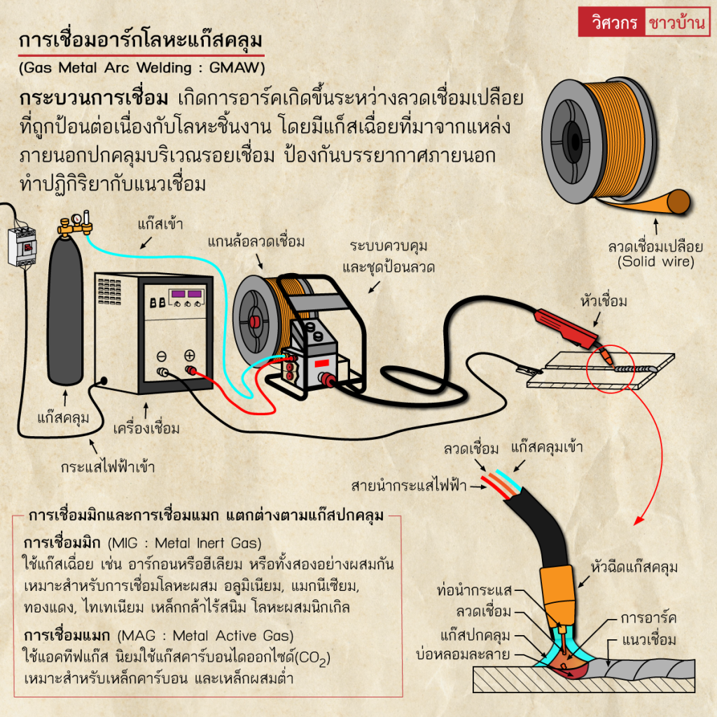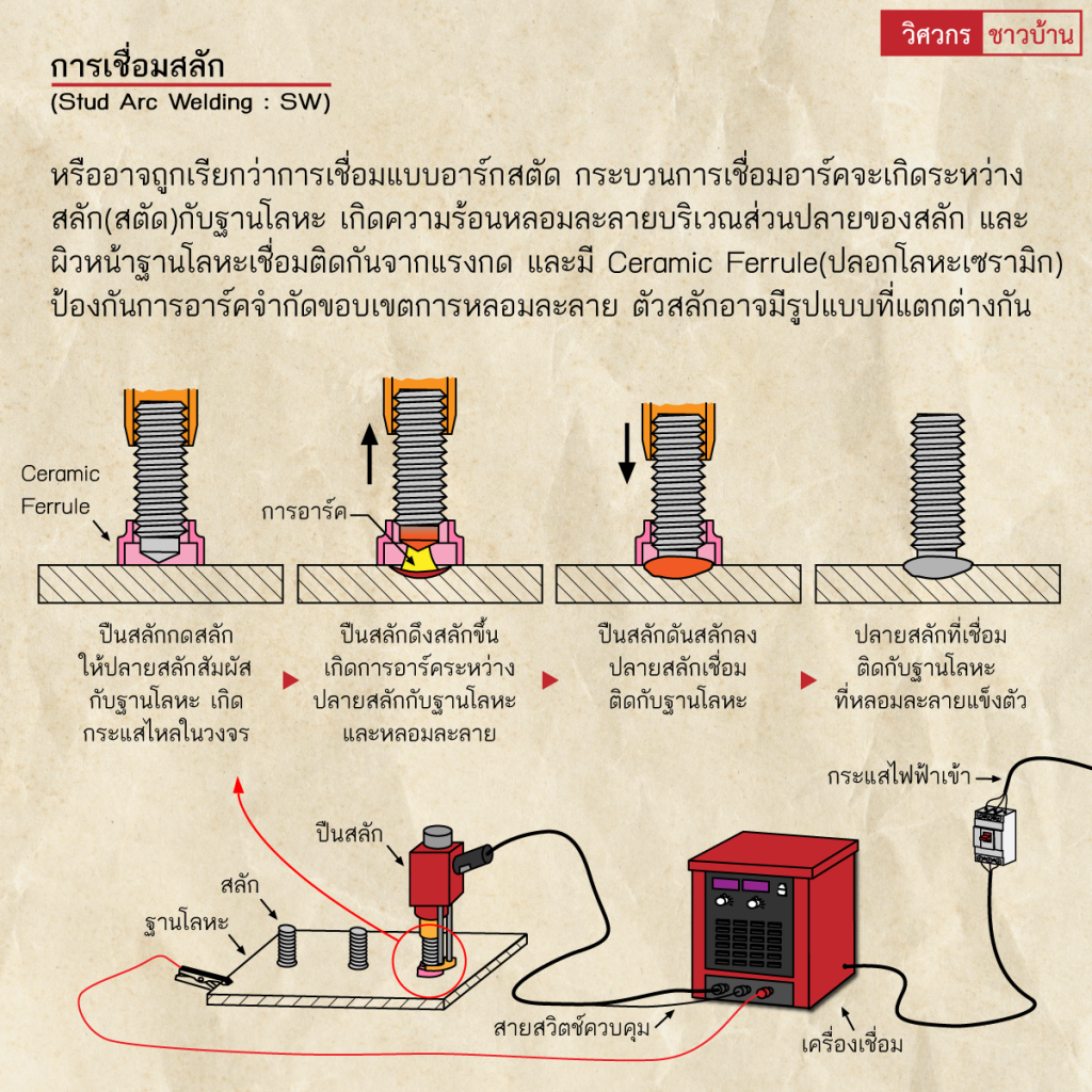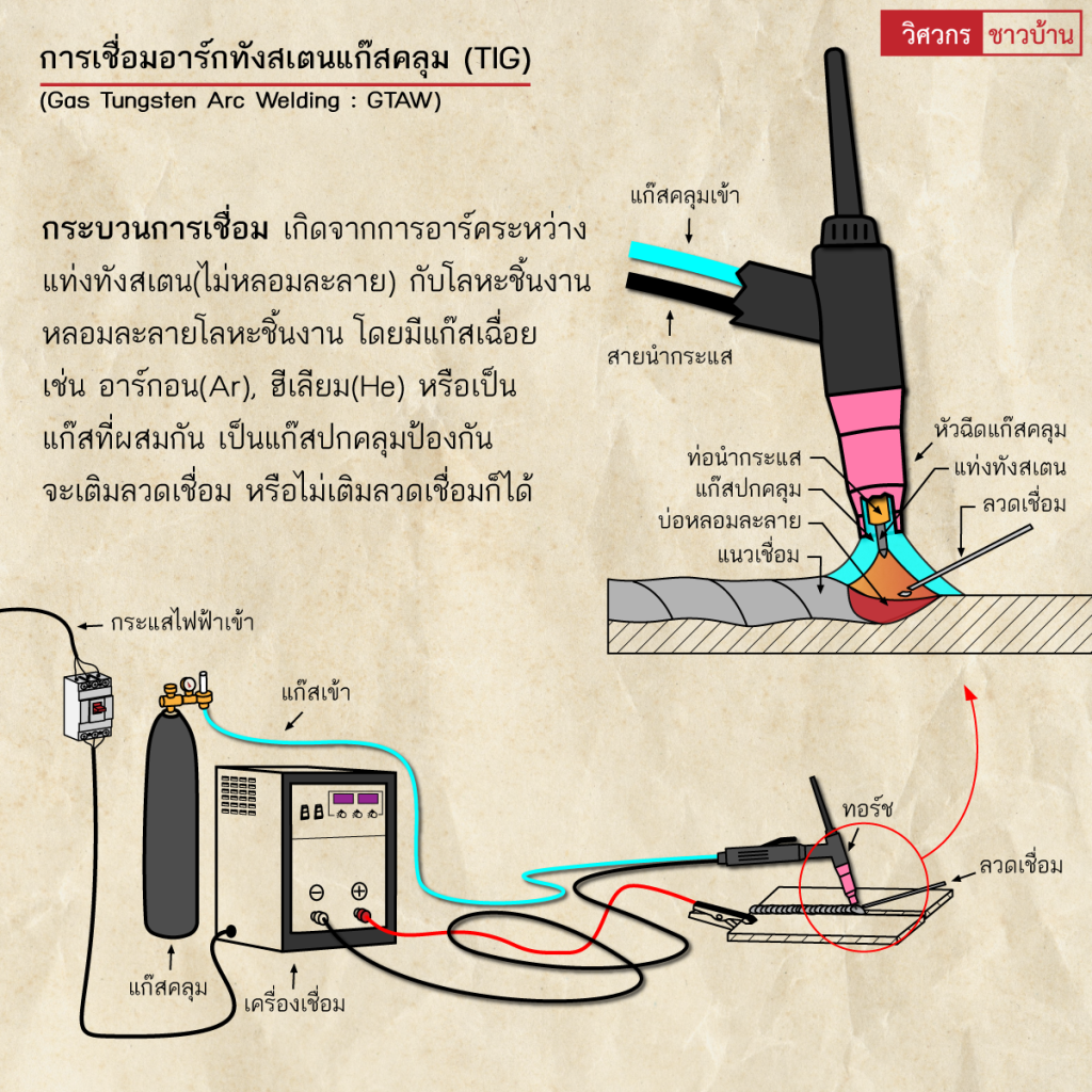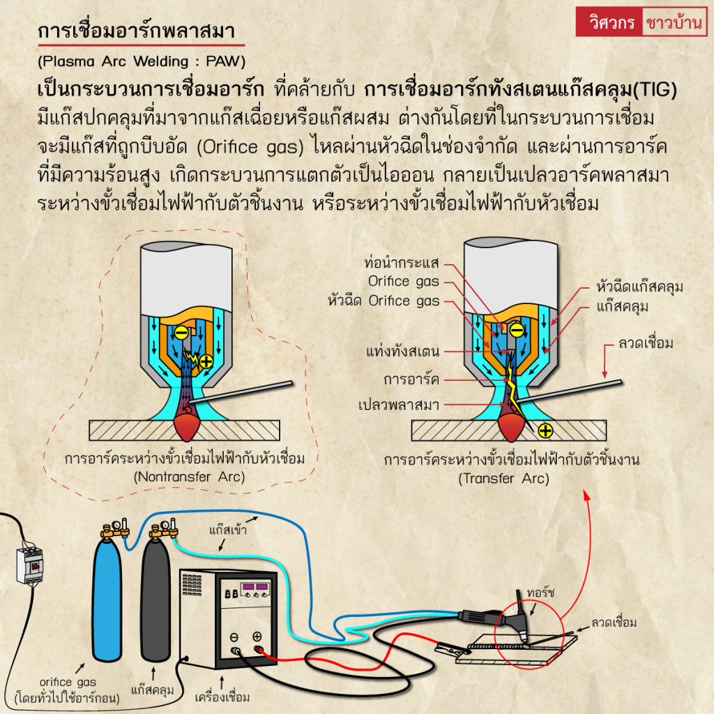 งานเชื่อมทั่วไปทำความรู้จักการเชื่อมอาร์ค(Arc welding) wisawakornchaobaan2 ปี ago2 ปี ago00 mins ทำความรู้จักการเชื่อมอาร์ค(Arc welding) เป็นกระบวนการเชื่อมที่ใช้การอาร์คไฟฟ้าเป็นแหล่งที่มาของความร้อน เกิดการอาร์คไฟฟ้าที่มีความร้อนสูง ระหว่างชิ้นงานกับปลายอิเล็กโทรดหรือลวดเชื่อม โดยแหล่งพลังงานไฟฟ้า มีทั้งไฟฟ้ากระแสตรง(DC) และไฟฟ้ากระแสสลับ(AC) โดยความร้อนสูงที่เกิดขึ้นระหว่างชิ้นงานกับปลายอิเล็กโทรด เกิดการหลอมละลายโลหะของชิ้นงานเชื่อมติดกัน และอาจมีการเติมโลหะเพิ่มเติม กระบวนการเชื่อมมีหลากหลายลักษณะ ตามการใช้งาน และมีฟลักซ์หรือแก๊สปกคลุมทำหน้าที่คลุมแนวเชื่อม ปกคลุมบ่อหลอมละลาย ป้องกันแนวเชื่อมทำปฏิกิริยากับบรรยากาศรอบๆ สร้างเป็นสแลกคลุมหรือแก๊สปกคลุมแนวเชื่อมขณะหลอมเหลวเพื่อเพิ่มประสิทธิภาพ และคุณภาพของแนวเนื้อโลหะเชื่อม#เชื่อม #เชื่อมไฟฟ้า #กระบวนการเชื่อม #arcwelding #วิศวกรชาวบ้าน #วิศวกร #ช่างเชื่อม จำนวนผู้ชม : 735 FacebookFacebookXXLINELine แนะแนวเรื่อง Previous: ทำความรู้จัก”เครื่องมือวัดระดับจากรังสี (Radiometric level measurement)”Next: ทำความรู้จัก”การจัดตำแหน่งเพลา(Shaft alignment)”เบื้องต้น