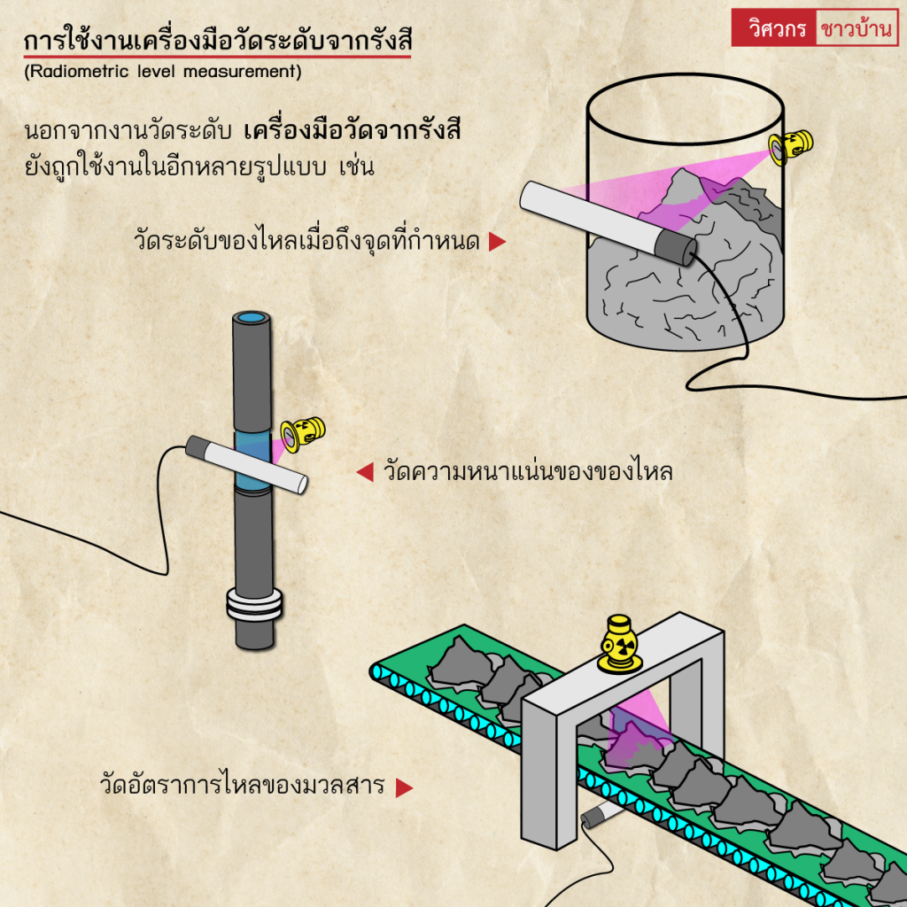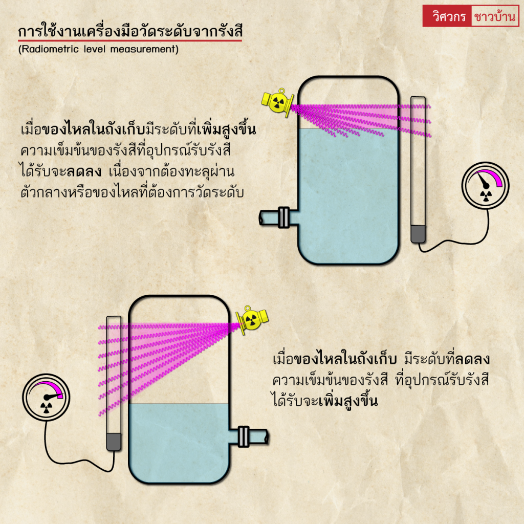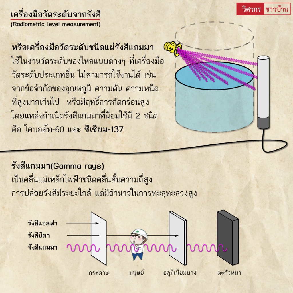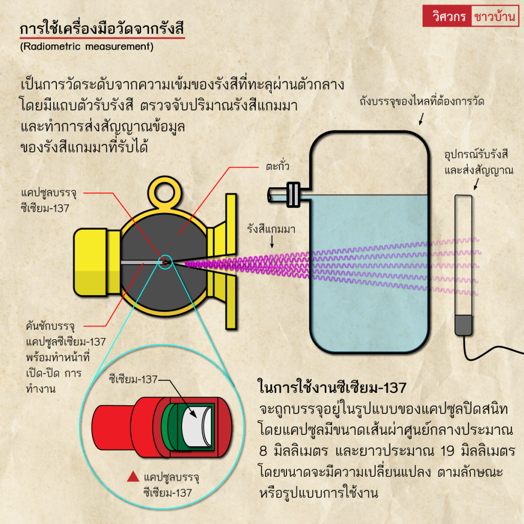 ทั่วไปทำความรู้จัก”เครื่องมือวัดระดับจากรังสี (Radiometric level measurement)” wisawakornchaobaan2 ปี ago2 ปี ago01 mins ทำความรู้จัก"เครื่องมือวัดระดับจากรังสี (Radiometric level measurement)" เครื่องมือวัดระดับจากรังสีหรือเครื่องมือวัดระดับชนิดแผ่รังสีแกมมา ใช้ในงานวัดระดับของไหลแบบต่างๆ ที่เครื่องมือวัดระดับประเภทอื่น ไม่สามารถใช้งานได้ เช่น จากข้อจำกัดของอุณหภูมิ ความดัน ความหนืดที่สูงมากเกินไป หรือมีฤทธิ์การกัดกร่อนสูง โดยแหล่งกำเนิดรังสีแกมมาที่นิยมใช้มี 2 ชนิด คือ โคบอล์ท-60 และ ซีเซียม-137#ซีเซียม137 #โคบอล์ท60 #ซีเซียม #เครื่องมือวัดระดับ #CeSIUM #วิศวกรชาวบ้าน จำนวนผู้ชม : 251 FacebookFacebookXXLINELine แนะแนวเรื่อง Previous: ทำความรู้จัก”ถังดับเพลิง(Fire Extinguishers)”เบื้องต้นNext: ทำความรู้จักการเชื่อมอาร์ค(Arc welding)